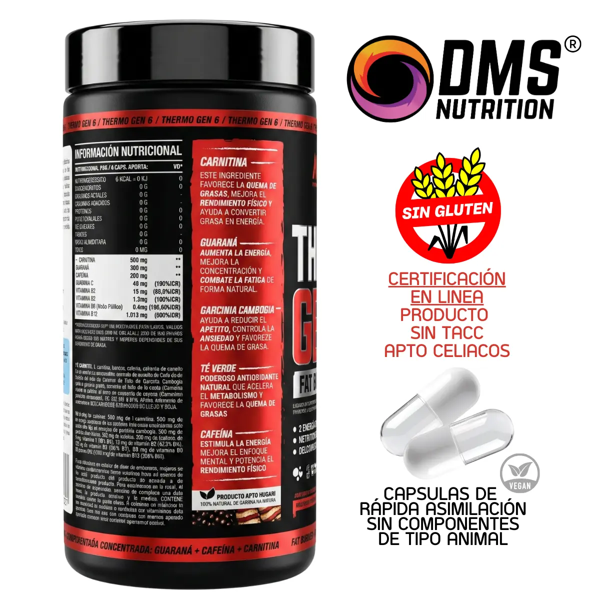 Thermo Gen 6 de DMS Nutrition es un quemador natural de grasas que combina dos ingredientes infalibles: cafeína y L-carnitina, diseñados para activar el metabolismo, mejorar el rendimiento y transformar la grasa en energía útil.